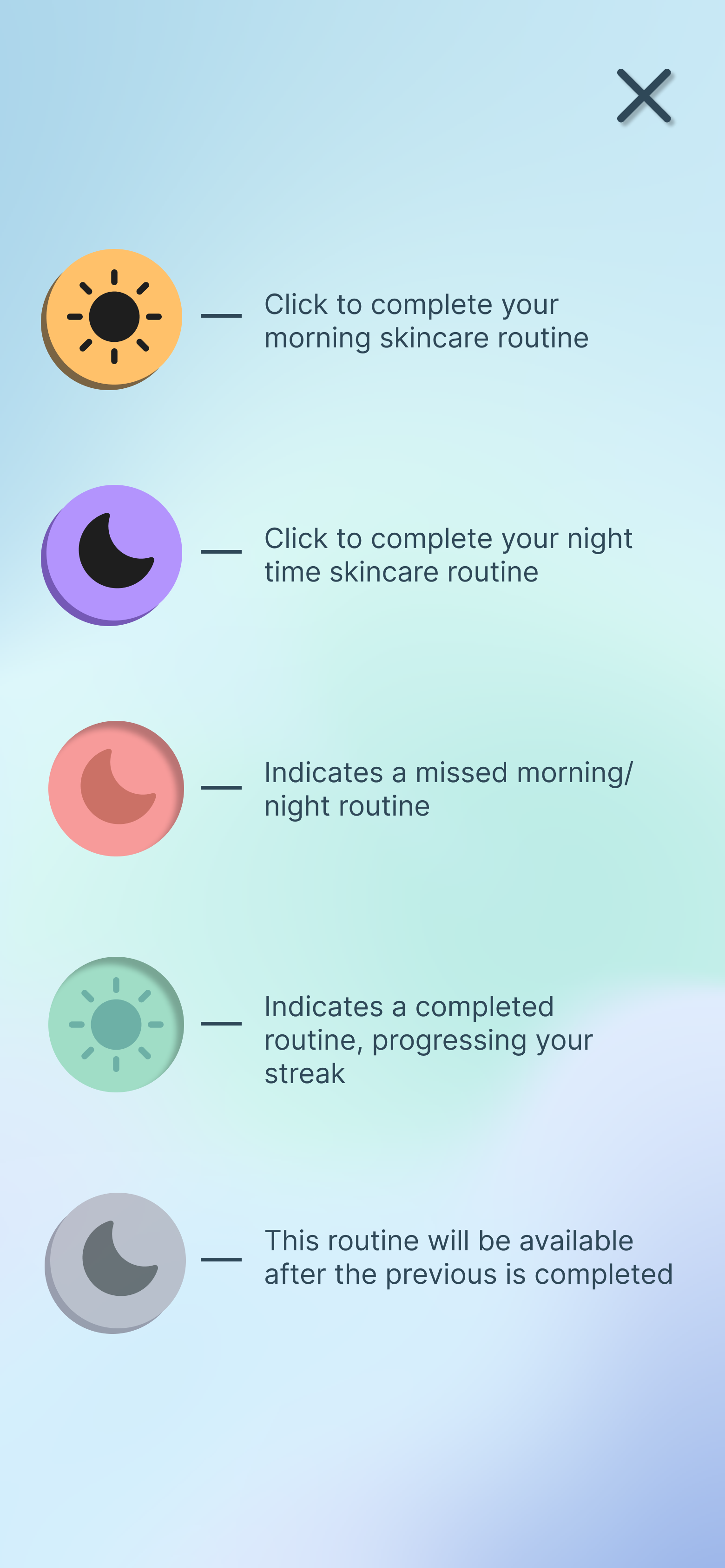 The main design concept i wanted to focus on was a sense of progression. By adding the sequence of the routine on the home page, the user can see the completed steps giving a sense of motivation to keep their streak going.